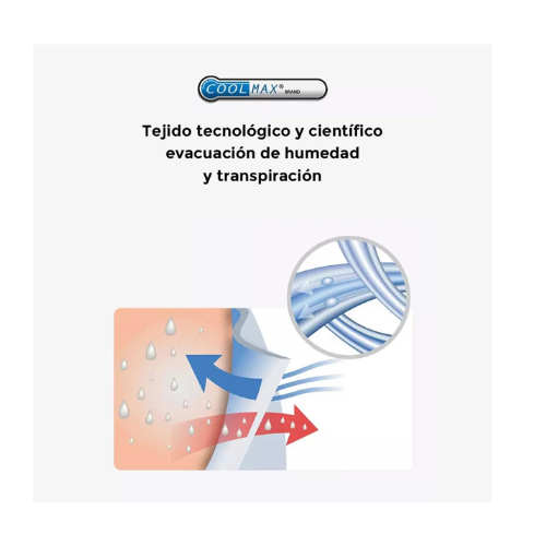 • Tejido Coolmax: Alta tecnología para una mayor transpiración y secado rápido.
