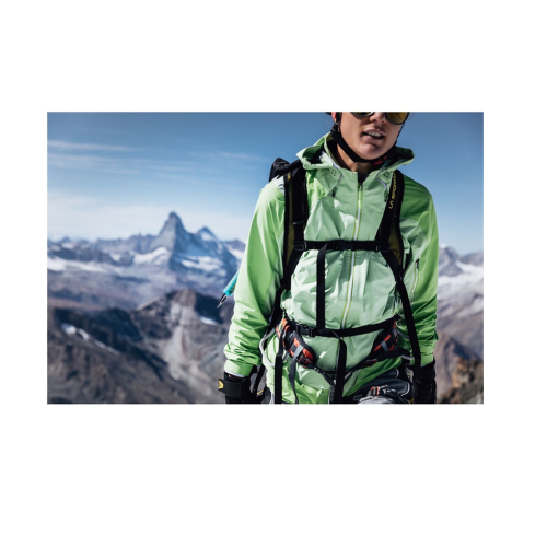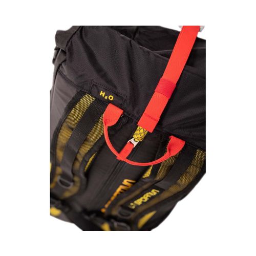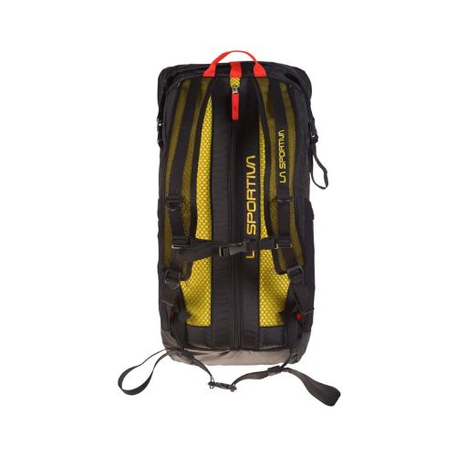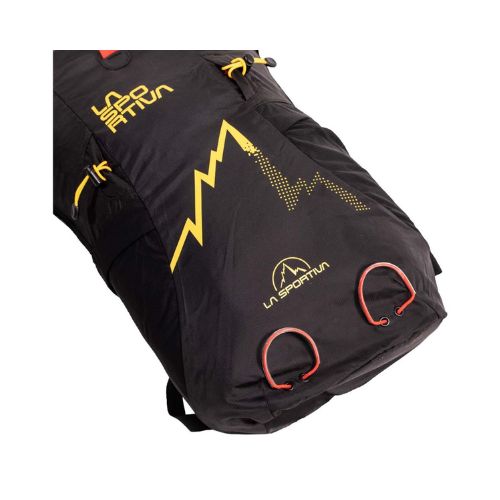 Mochila ultraligera en nylon reforzado y malla, bolsillo interior para objetos, correas para hombros y cinturón ventral. Compatible con sistemas de hidratación.