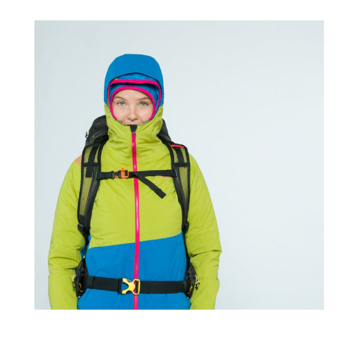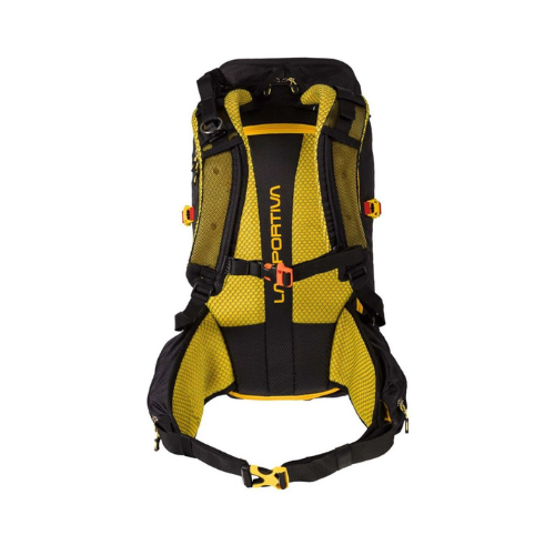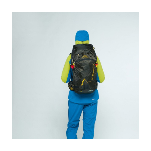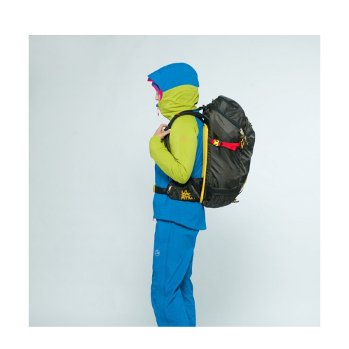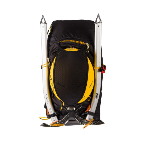 Mochila de esquí de montaña con soporte para piqueta, ganchos laterales dobles y accesorio de esquí en diagonal, compatible con varios sistemas de hidratación.